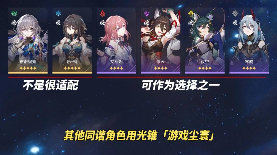 除花火,还剩下6位同谐:布洛妮娅、阮梅、艾丝妲、停云、驭空、寒鸦。其他同谐角色与光锥「游戏尘寰」的适配度如何呢?