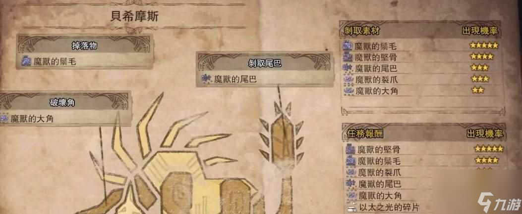 属性:贝希摩斯的属性弱点是龙属性;还能被麻痹、睡眠,用异常状态限制它的行动是个不错的选择。闪光弹对贝希摩斯有效,可以打断它的施法。但是,闪光弹将重置贝希摩斯的仇恨对象,需谨慎使用。