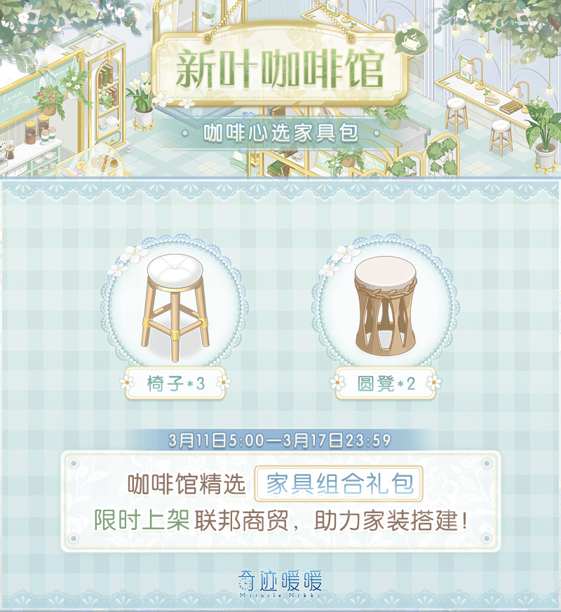 在小屋愿之庭的限时抽奖阁“新叶咖啡馆”许愿,可获得清新咖啡馆主题精美家具!活动期间,每2天可免费“许愿一次”,并半价“许愿五次”一次。