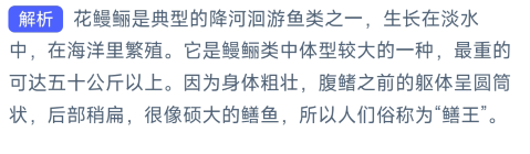 解析:鳝王是民间对花鳗鲡的一种俗称,因为它长得太像鳝鱼了,但是个头却要比鳝鱼大很多倍。在有些地方也叫它白鳝、鳗鱼、大鳗、鲈鳗、花鳗、雪鳗、乌耳鳗、芦鳗、溪鳗等。