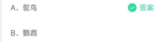 解析:鸵鸟是世界唯一只有两个脚趾的鸟类,但内脚趾特别发达,可以轻松腾空2.5米,冲刺速度在每小时70公里以上。