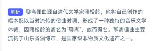 解析:聊斋俚曲,流行于山东省淄博市的地方传统音乐,国家级非物质文化遗产之一。