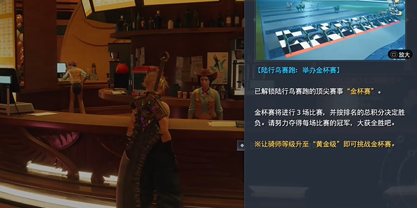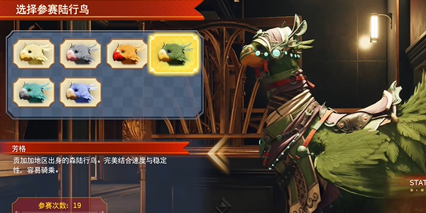 4、我们需要完成陆行鸟赛跑:金杯赛。进入金杯赛前的搭配推荐森陆行鸟,其能力可以跨越障碍物。配装方面建议神秘套,速度比较优秀,如果旁边的陆行鸟商店没有,需要去贡加加村的陆行鸟商店。
