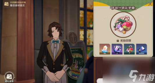 第二步:与杰伊对话街区今天的任务,是需要玩家获得美食【多味什锦彩梦糖】的制作材料,分别是碎梦和虚粒子。
