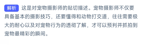 解析:这是对宠物摄影师的贴切描述。宠物摄影师不仅要具备基本的摄影技巧,还要懂得和动物打交道,往往需要极大的耐心以及对宠物行为的透彻了解,才可以预判并抓拍到宠物最精彩的瞬间。