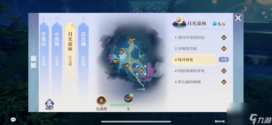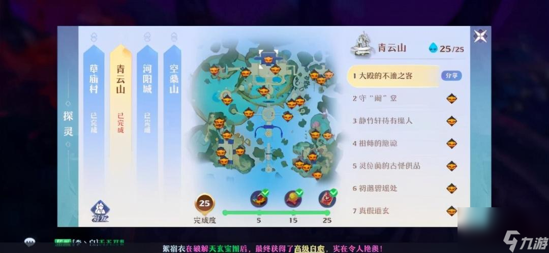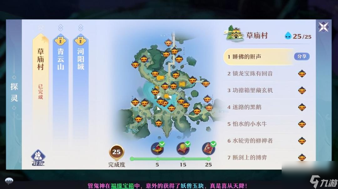 草庙村、青云山、河阳城、空桑山、小池镇、月光森林、昌合城探灵位置各有25个,每一个地图探灵,捉到所有灵妖妖,完成之后可以拿到灵兽高级技能书!