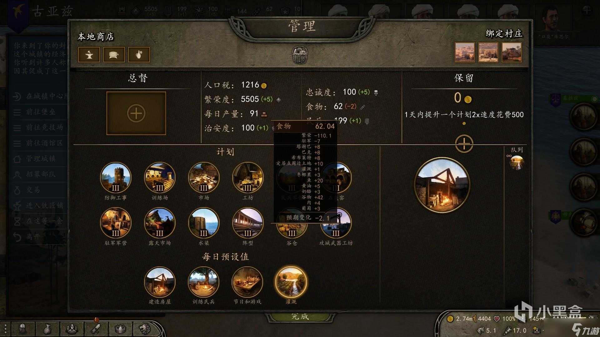 城镇和城堡建设都共用下图这套系统,可以看出城镇和城堡都受限于几个数据:繁荣度,每日产量,治安度,忠诚度,食物,民兵等,我们来逐一分析下这些数据都起什么作用。