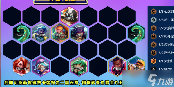 这套阵容一般以心之钢玩法过渡为主,EZ和女警是中期的主要伤害来源,后期可以逐步减少心之钢棋子,慢慢替换成二星五费卡。