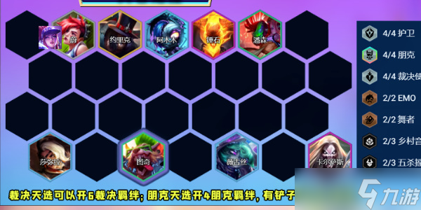 前期用朋克裁决护卫过渡到七人口也可以用其他天选打工到七人口。七人口慢搜三星薇古丝、三星阿木木、三星图奇和三星潘森,大成后升八人口和九人口根据天选找护卫增加前排坦度或开6裁决提供更高伤害。