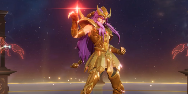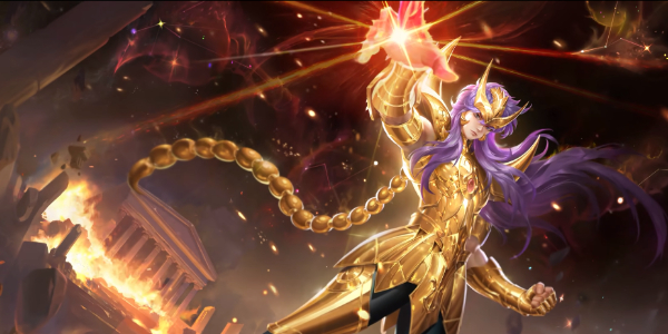 米罗身穿金光闪闪的天蝎座黄金圣衣,一头紫色长发搭配天蝎座圣衣经典的黄金头盔 ,头盔上的辫饰即为蝎子的尾巴,霸气十足。他的技能特效化为天蝎座圣斗士的绝技——“猩红毒针”,毒针释放,圣柱升起,流光转动,给玩家带来新的视觉体验。