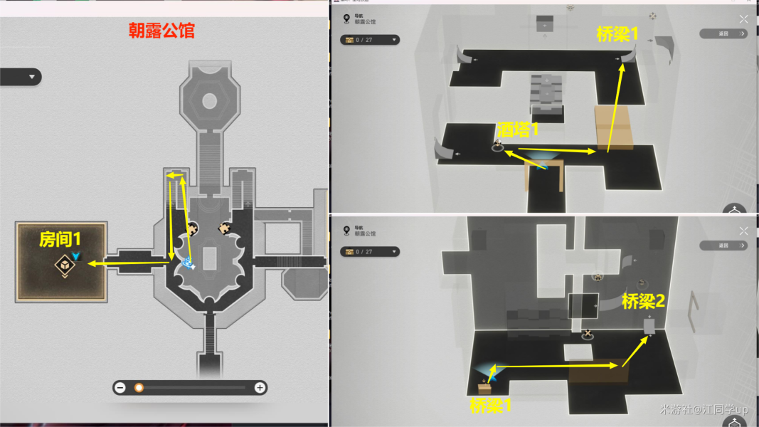 (1)来到【朝露公馆】下图位置【房间1】里面,从【酒塔1】获得次数后,从【桥梁1】上去,接着从【桥梁2】上去
