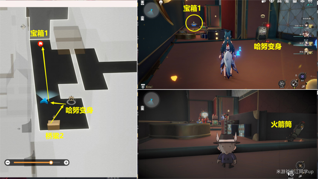 (2)接着来到下图位置变身哈努后,去拾取【碎拼1】【宝箱1】和【碎拼2】【火箭筒】