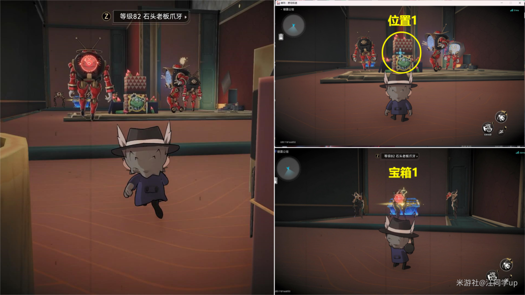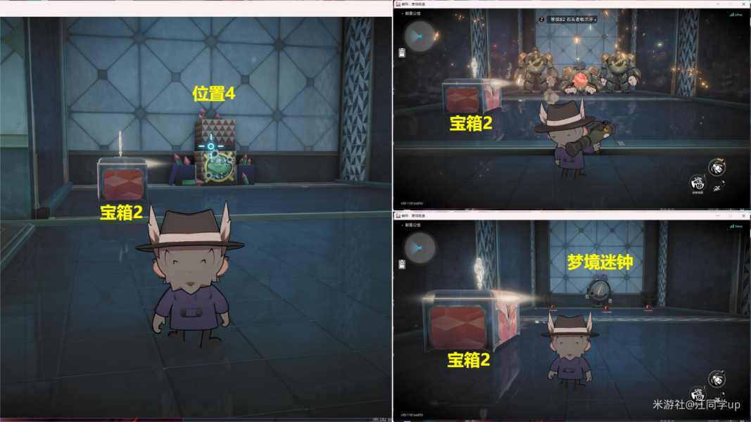 (5)然后从下图【位置2】进去,进去后,将【位置3】打开后,里面是【宝箱2】,接着再将【位置4】打开后,打掉里面的3个怪后,里面有个【梦境迷钟】解密