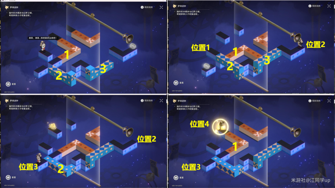 3)将1橙色模块点击旋转1次,【钟表小子】会从位置3到位置4,解密完成