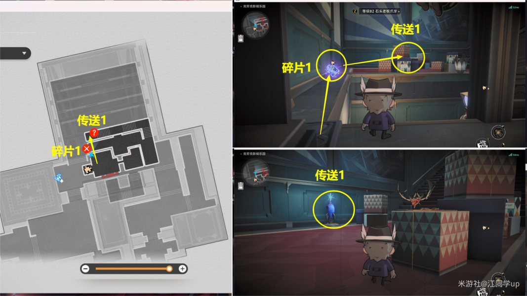 (3)接着来到下图位置拾取【碎片1】后,从【传送1】位置飞上去【传送2】位置