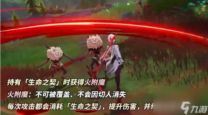 当阿蕾奇诺身上持有「生命之契」时,普通攻击、重击与下落攻击将转化为无法被附魔覆盖的火元素伤害,并会在每次普通攻击命中敌人时,消耗「生命之契」来提升攻击伤害,并缩短战技冷却。由于「生命之契」不会因为切换角色而消失,意味着仆人的火附魔可以用来前置挂火扩散,配队和输出轴也会更自由些~