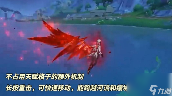 持续长按重击,会进入快速移动状态。从呈现的状态来看,应该与那维莱特是相似机制,脚底浮空,可跨越河流以及快速攀登缓坡,但移动速度更快些。这种额外机制也不占用天赋,在实战转移战场或大世界部分地形有用,挺好的。