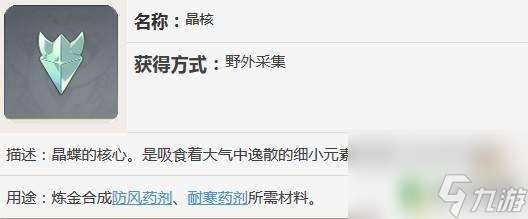 在原神游戏中,晶核的作用是用于炼金合成。可以用来合成浓缩树脂、防风药剂和耐寒药剂,晶核的获得方法在野外抓捕风晶蝶获得,风晶蝶是蝴蝶的一种,和蝴蝶不同的是风晶蝶周围环绕着风元素,普通蝴蝶抓捕后只能获得蝴蝶翅膀,不会获得晶核。