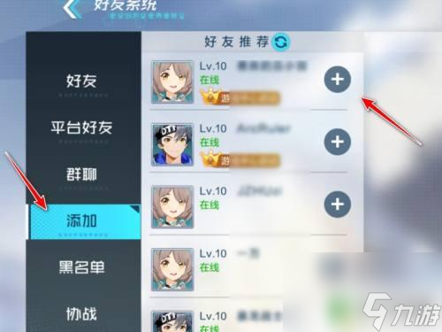 3.在列表中进入添加,点击好友后面的加号即可申请好友。