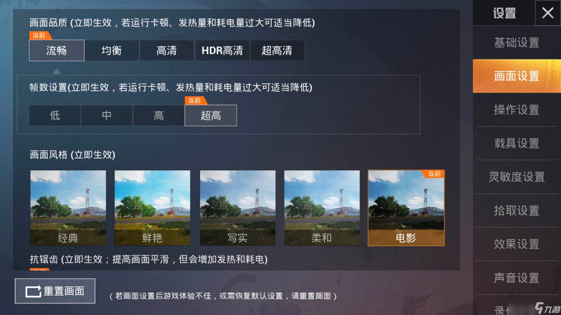 打开设置界面,把画质设置成流畅,高画质会导致手机发烫屏幕卡顿多,手机运行带不起这种高消耗的话也会导致掉帧问题,就算已经修复BUG,玩家没有设置好操作界面的话同样会导致掉帧,关闭“锯齿”功能,这个会特别消耗手机电量,电量越低也会导致卡顿。