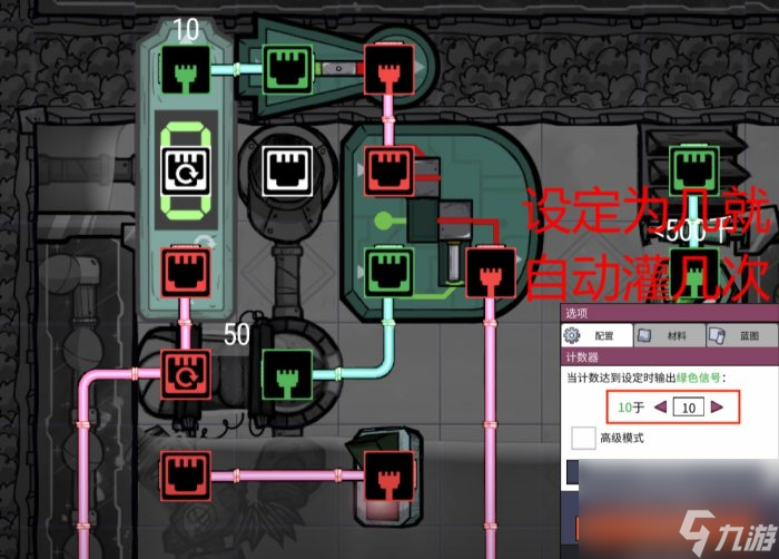 在给火箭灌燃料之前,最好先算好需要多少燃料,然后给对应的燃料舱或氧化剂仓设定好上限,在我们设置好火箭的上限后,我们可以使用液体计量阀精准的输出对应的质量,避免有液体堵在管道里导致爆管,点击计量阀,可以设置0-500kg,比如图中设置的是500kg,上面显示的350kg指的是已经流过计量阀的数量,当流过的液体量达到设置的500kg后,计量阀就会关闭不再输出液体,信号计数器不要勾选高级模式,计数器设定为多少,就会自动控制计量阀工作几轮。