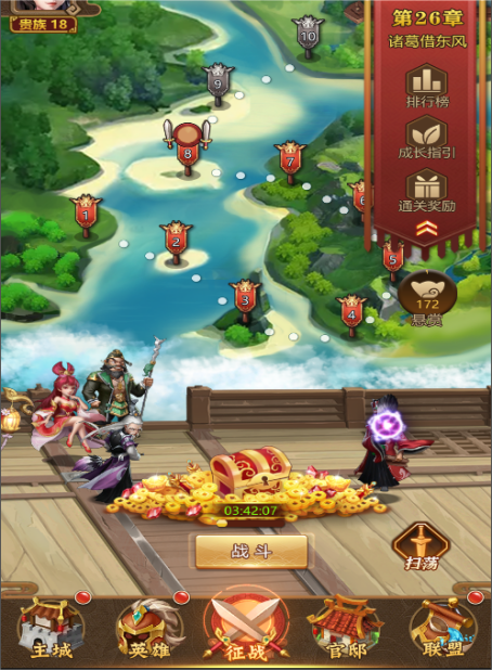 a)概述:征战作为本游戏的前期主要玩法,玩家组建阵容打败敌方获得胜利,即可获得奖励。关卡分为56大章节,每个章节有10小关。