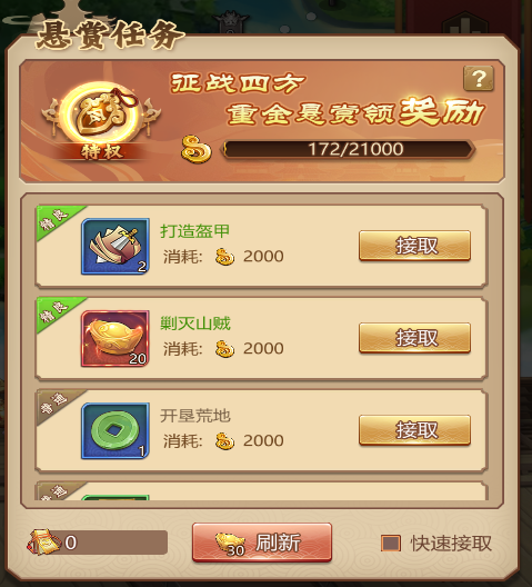 a)概述:完成悬赏任务需要派遣符合条件的英雄进行完成,并在n个小时后可领取该奖励,任务可通过元宝加速快速完成。接取任务需要消耗悬赏积分,悬赏积分从闯关和挂机奖励中获得。玩家每日有2次免费刷洗任务的机会,也可消耗悬赏刷新令或元宝进行刷新。