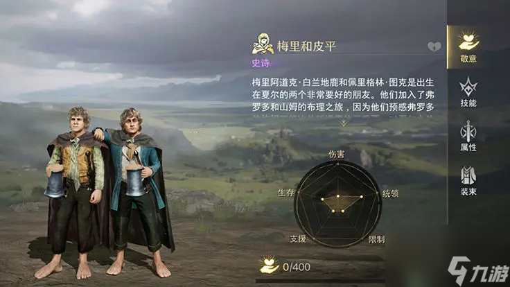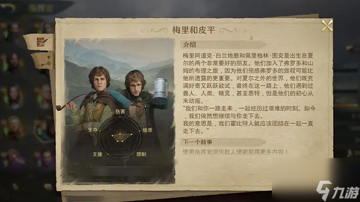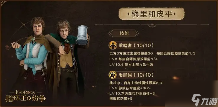 在游戏中,他们同样是出色的辅助伙伴,统领和生存属性较好,而作为霍比特人,他们身手敏捷,使得他们在战斗中能够快速移动和躲避敌人的攻击。