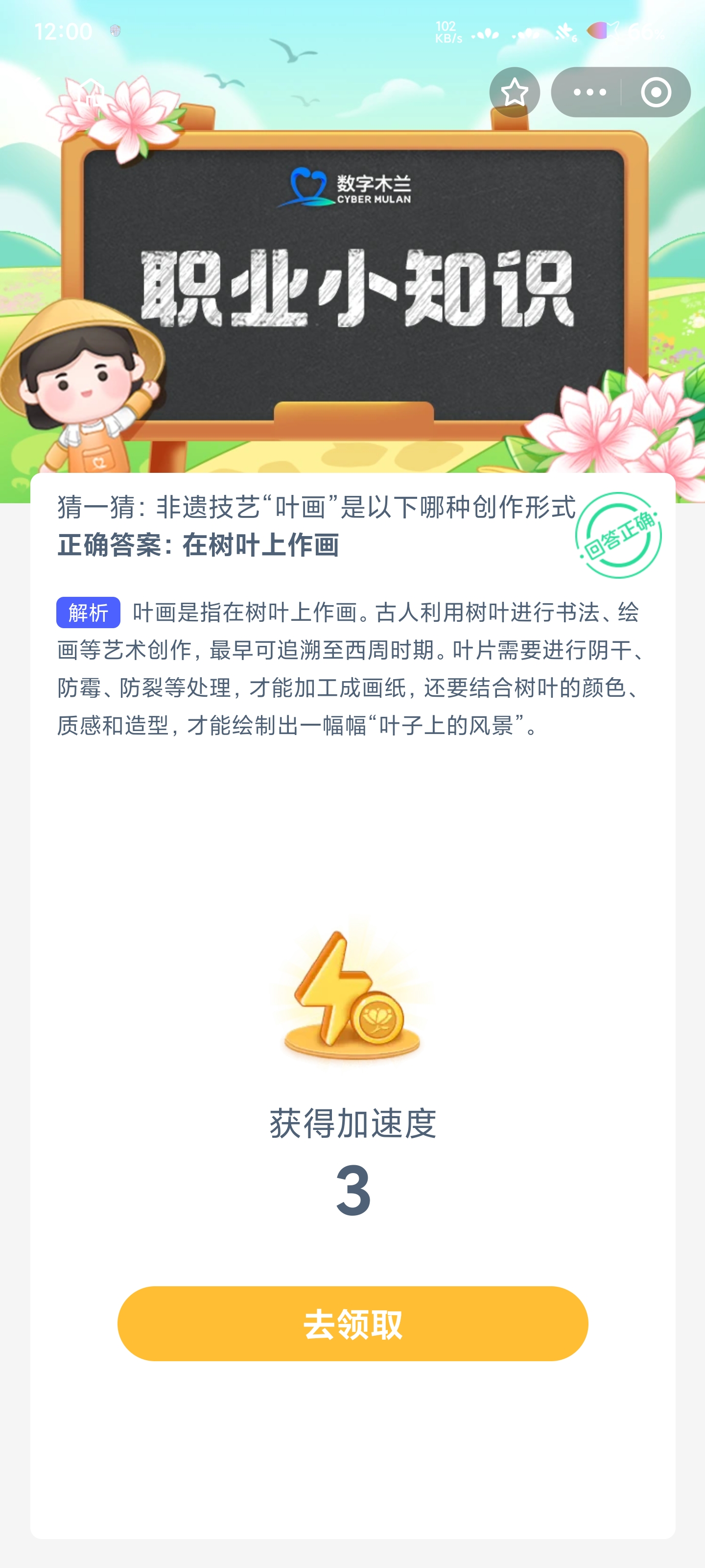 解析:叶画是指在树叶上作画。古人利用树叶进行书法、绘画等艺术创作,最早可追溯至西周时期。叶片需要进行阴干、防霉、防裂等处理,才能加工成画纸,还要结合树叶的颜色、质感和造型,才能绘制出一幅幅“叶子上的风景”。