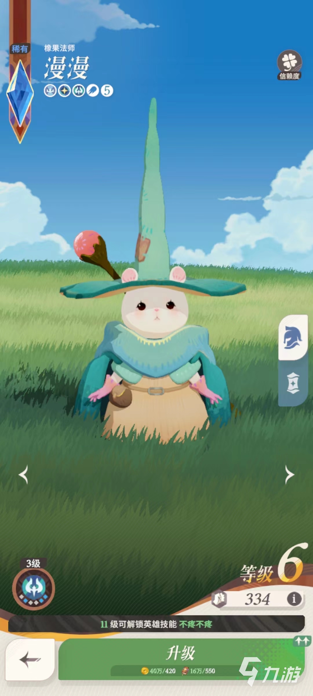 漫漫在游戏中的称号是橡果法师,自身外观可爱,戴着一顶高高的帽子,技能方面非常简单,只有三个技能可以使用。第1个是必杀技爆炸火花,蓄力后发射一个火球,对敌人造成伤害,伤害,最多能达到攻击力的340%,从伤害数值方面来看还算优秀。