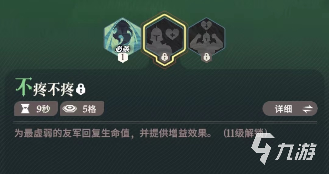 第2个技能不疼不疼,有9秒钟的冷却时间,伤害距离为5格。选择一个最虚弱的友军恢复生命值,并提升该目标10%的攻击力,持续5秒钟。回复的数值达到满级时为攻击力的190%。