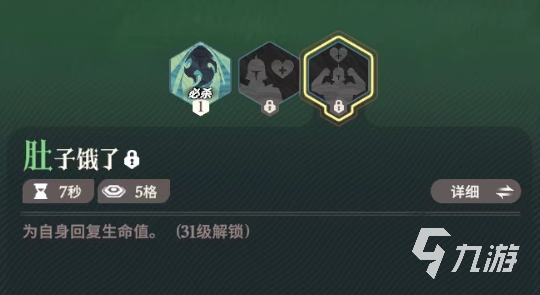 最后一个是肚子饿了,有7秒的冷却时间,施法距离5格。为自身恢复生命值,只有当生命值比例低于70%的时的时候才能释放,该技能满级时回复的血量为攻击力的250%。大家在前期使用主要是利用它的回血效果,这样能起到治疗的目的。