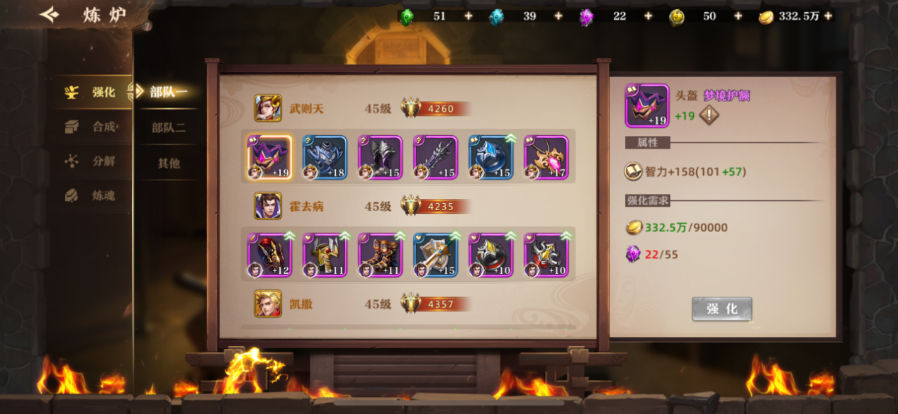 强化:可以消耗金币和不同等级的强化石来强化英雄装备。提升英雄装戴的四维属性,以提升英雄战场能力。