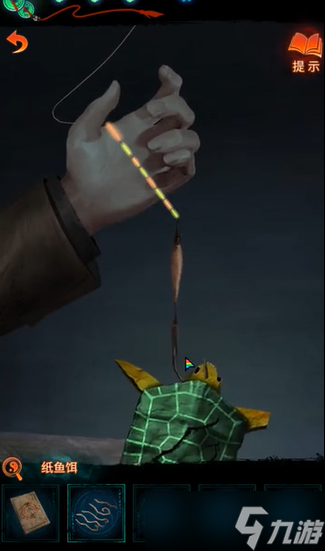 2、接着使用在渔夫那获取的纸鱼饵钓鱼,即可钓到一只绿色的乌龟