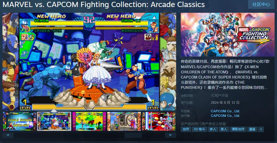今日(8月28日),经典格斗游戏合集《漫威vs.卡普空格斗合集:经典街机》Steam平台预购现已开启,游戏国区售价248元,支持简繁体中文,已通过SteamDeck认证,预计于9月12日正式发售,感兴趣的玩家可以点击此处进入商店页面。
