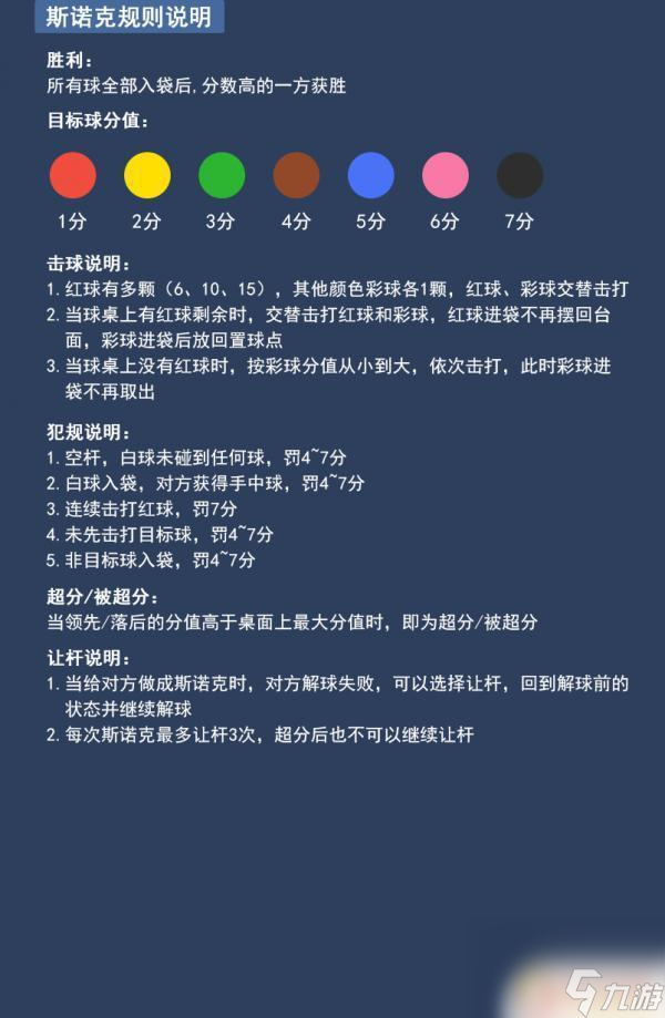 胜利:所有球全部入袋后,分数高的一方获胜目标球分值:如图击球说明:1、红球有多颗(6、10、15)。其他颜色彩球各1颗,红球、彩球交替击打2、当球桌上有红球剩余时,交替击打红球和彩球,红球进袋不再摆回台面,彩球进袋后放回置球点3、当球桌上没有红球时,按球分值从小到大,依次击打,此时彩球进袋不再取出犯规说明:1、空杆,白球未碰到任何球,罚4~7分2、白球入袋,对方获得手中球,罚4~7分3、连续击打红球,罚7分4、未先击打目标球,罚4~7分5、非目标球入袋,罚4~7分超分/被超分:当领先/落后的分值高于桌面上最大分值时,即为超分/被超分让杆说明:1、当给对方做成斯诺克时,对方解球失败,可以选择让杆。回到解球前的状态并继续解球2、每次斯诺克最多让杆3次,超分后也不可以继续让杆