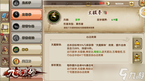 接下来才是重点,60级达成后,要知道游戏内早就有70~100级的心法插槽,因此未雨绸缪总没有错。到达70级后就可以开启神功盖世!80级开启天魔解体!这两个心法效果配合太极拳本身非常优异,天魔解体配其它可能效果并不明显,但是配太极拳的效果极为突出,击杀目标有几率获得天魔解体效果提升自身攻击力20%,神功盖世直接又提升了一层基础伤害,此套路潜力极大。再往后100级之前可以根据自身需要再开一个心法,有五行心法这并不难。
