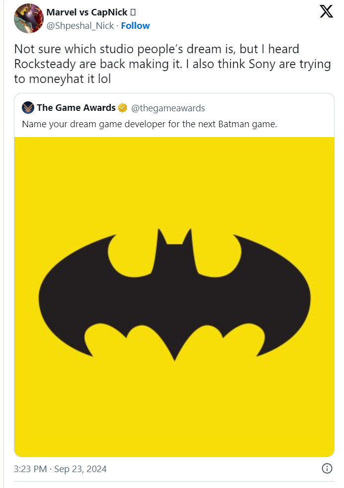 消息来自XboxEra频道创始人Shpeshal Nick,他在X上发文称他听到Rocksteady回归制作一个《蝙蝠侠》游戏,不是复刻,也不是重制,而是新作。此外,索尼也试图资助这款游戏,让该作成为PlayStation主机平台独占。