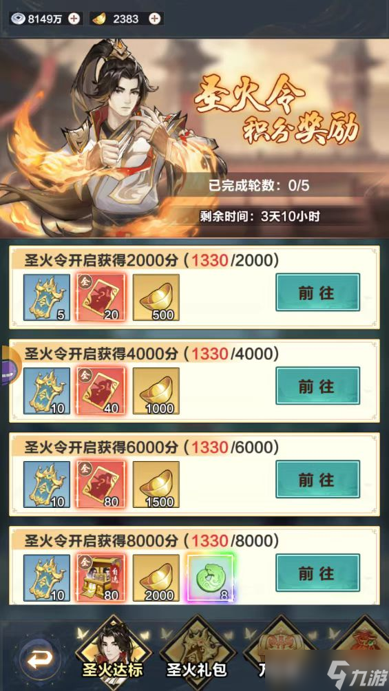 圣火令:玩家在主页通关的时候时候可以前期单上郭劲,过关比较快,从而可以多领取圣火令,然后用圣火令去抽取礼包,从而集齐圣火达标可以领取很多招募令以及礼包。