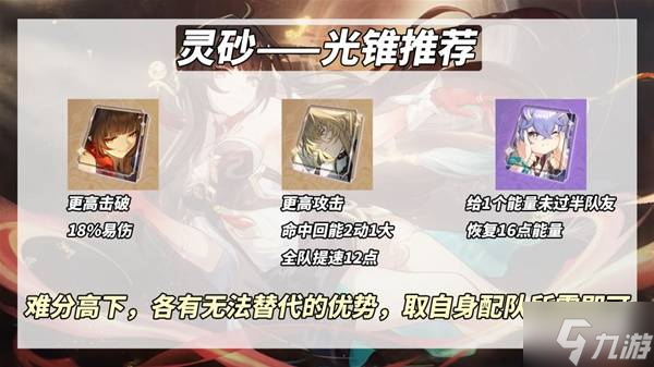 最优选自然是搭配流萤,可为灵砂创造稳定的火弱环境,搭配其他击破角色则更多是为了‘稳定治疗、击破易伤’这2项能力。