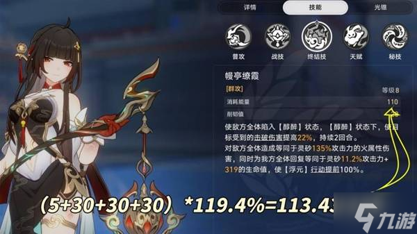 ※灵砂的战技/普攻都是恢复30点能量,在搭配充能绳时可以做到稳定3动1大:(5+30+30+30)*119.4%=113.43>110大招所需能量。