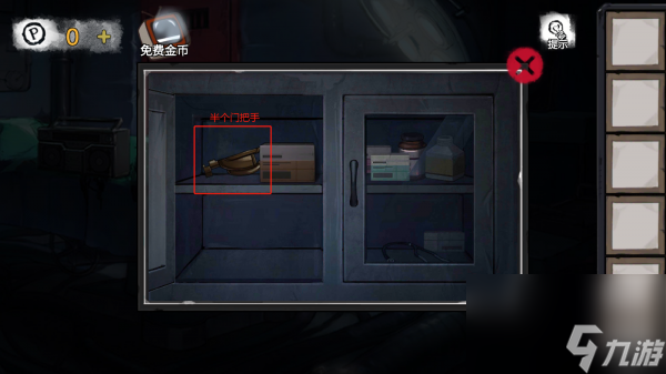 房间一:治疗室挪开左上角的药品盒,得到【半个门把手】1。