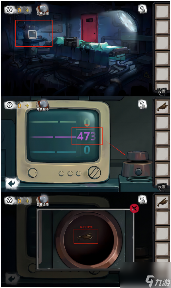 房间一:治疗室点击监护仪,看到密码【473】,点击右下角【按钮】,输入密码,得到【半个门把手】2。
