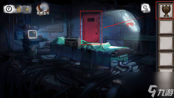 房间一:治疗室对红色铁门使用【门把手】,开门,进入下一个房间。