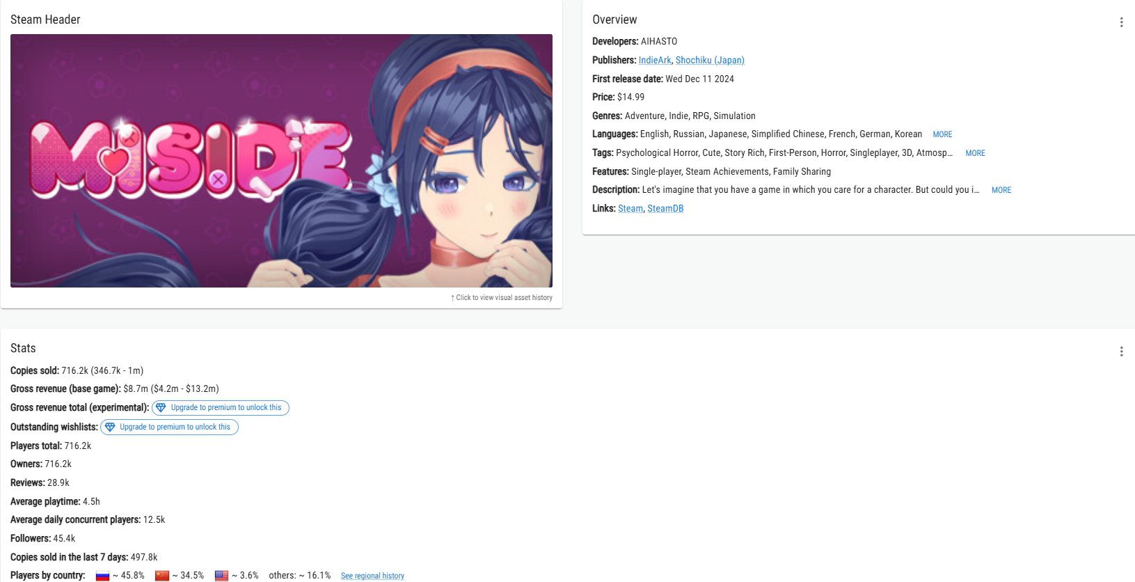Gamalytic估算:恐怖游戏《米塔》销量破70万份