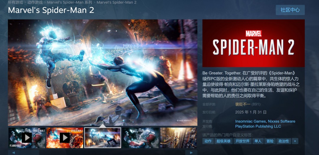 《漫威蜘蛛侠2》PC已发售 国区398元、褒贬不一