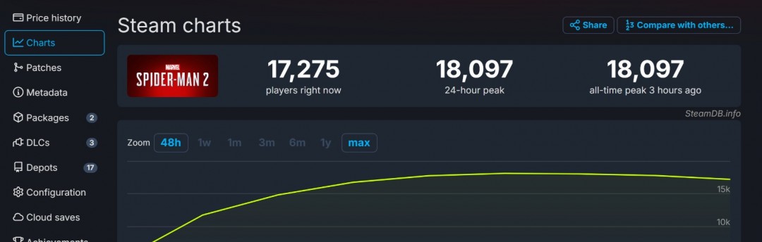 根据SteamDB,《漫威蜘蛛侠2》同时在线峰值为18097人,当前在线17275人。考虑到该作刚刚首发没几个小时,已有接近2万的在线,说明《漫威蜘蛛侠2》还是有蛮高的人气的。