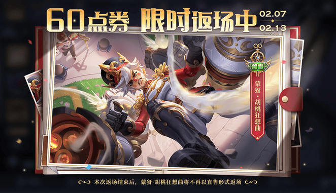 本次返场结束后,蒙犽-胡桃狂想曲皮肤将不再以直售形式返场。