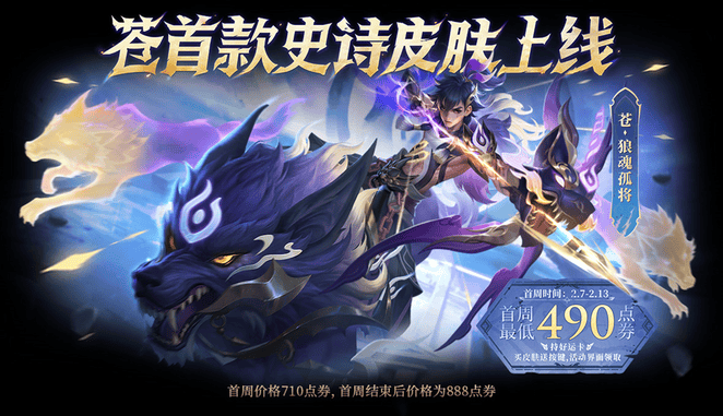 若拥有蛇年新春好运卡(开卡价180点券),购买苍-狼魂孤将皮肤,首周价格低至490点券