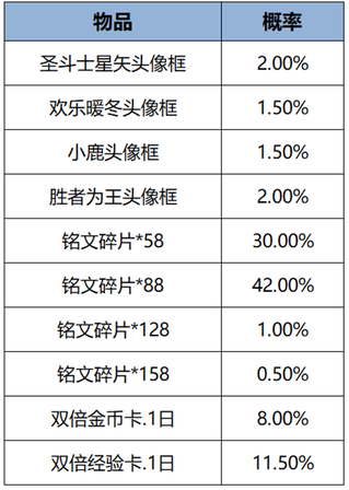 打开后可随机获得以下奖励之一:圣斗士星矢头像框、欢乐暖冬头像框、小鹿头像框、胜者为王头像框、双倍金币卡:1日、双倍经验卡:1日、铭文碎片x158/128/88/58。